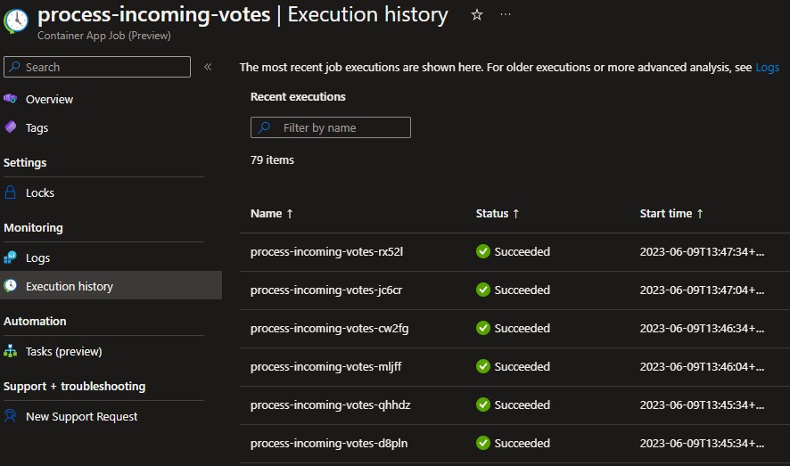 When I opened the properties of my Container Apps Job in the Azure Portal, I saw some executions in the Execution history, that all succeeded. Now, to be honest, this wasn’t exactly my first shot. I had some struggles getting the az CLI command right and obviously the app itself was not perfect at the beginning. But I think it’s fair to say I’m pretty surprised how easy it is to create a job and I am eager to see how this service will mature.